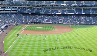 The boys were fine after they came back from the playground (I made them scrub their hands), and as we exited the ballpark after the game. As soon as we got out, I pulled out the wipes and had everybody scrub off their hands again (especially as we had deviated from the “peanut safe route” in order to visit the restrooms on the way out.)
