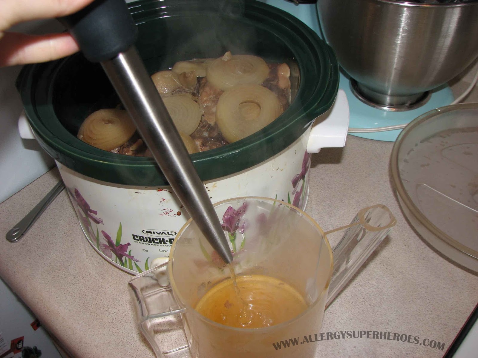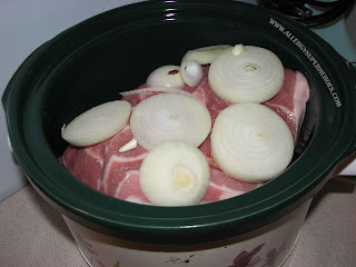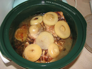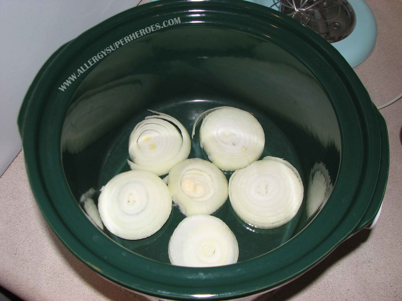 - Layer one sliced onion in the bottom of your crockpot.