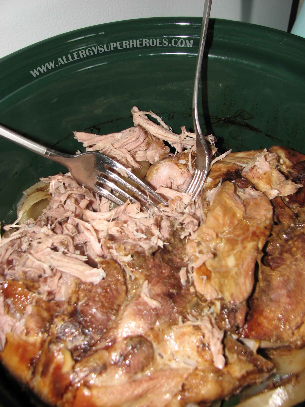 Using two forks, shred the pork. Remove any bones or large pieces of fat that remain (most of the fat will have cooked down, and you removed it with the juices.)